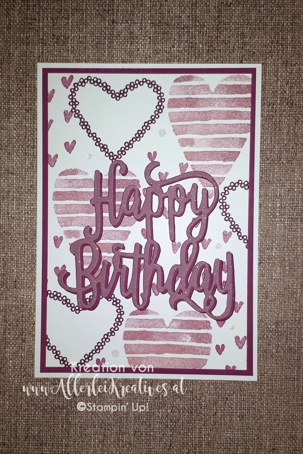 Den Schriftzug habe ich mit den Thinlits Happy Birthday jeweils aus zarte Pflaume und Sommerbeere ausgestanzt und versetzt über einander geklebt. Dann noch mit dem Wink of Stella Glitzer-Pinselstift beglitzert. Außerdem habe ich auf der Karte noch einige klare glitzer Epoxidakzente angebracht.
